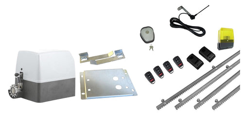 Σετ για συρόμενη γκαραζόπορτα με μοτέρ KINISIS-600, για έως 600 κιλά πόρτα, με ενσωματωμένο πινακοδέκτη , 4m μεταλλική κρεμαγιέρα, 1 ζευγάρι φωτοκύτταρα ασφαλείας, 1 φανό, 1 κεραία εξωτερική, 1 μπουτόν κλειδί και 4 τηλεχειριστήρια . Περιλαμβάνονται: βάση στήριξης, λαμάκια ενεργοποίησης τερματικών διακοπτών, κλειδιά αποσύμπλεξης, οδηγίες εγκατάστασης στα Ελληνικά κλπ.