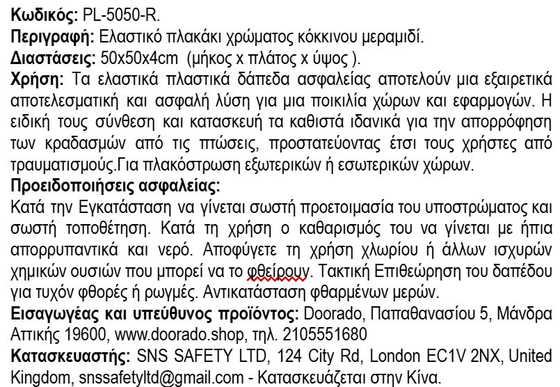 Διαστάσεις: Μήκος 50cm, πλάτος 50cm, ύψος 4cm, Βάρος 9.5Kg/τεμ
