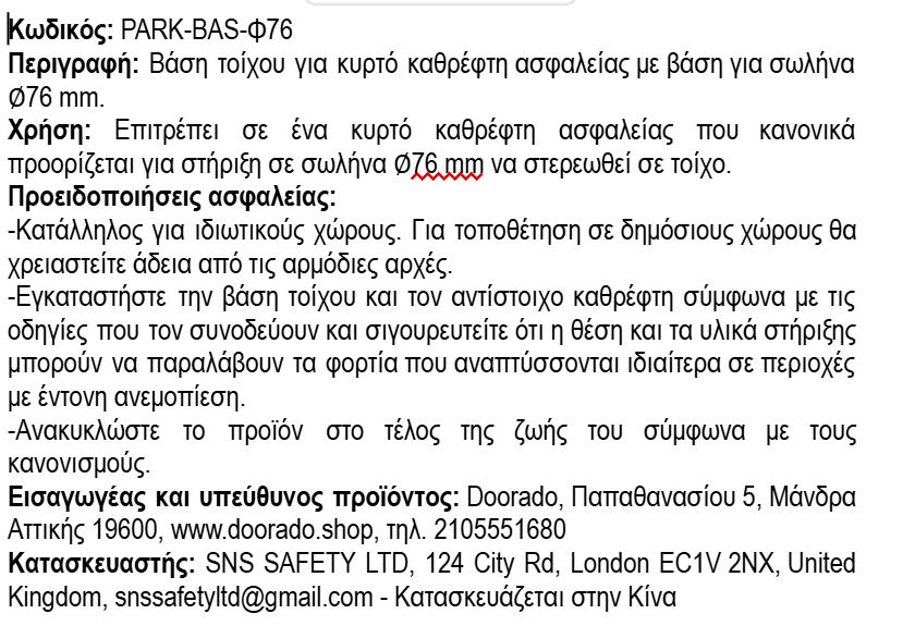 Βάση για Μετατροπή της Στήριξης Εξωτερικού Καθρέφτη Ασφαλείας από Σωλήνα Φ76 σε Τοίχο PARK-BAS-Φ76