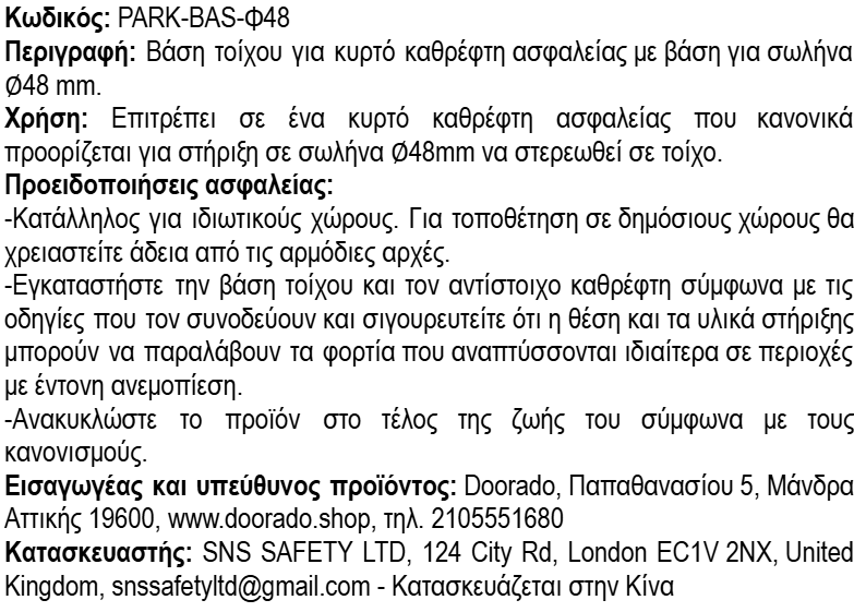 Βάση για Μετατροπή της Στήριξης Εξωτερικού Καθρέφτη Ασφαλείας από Σωλήνα Φ48 σε Τοίχο PARK-BAS-Φ48