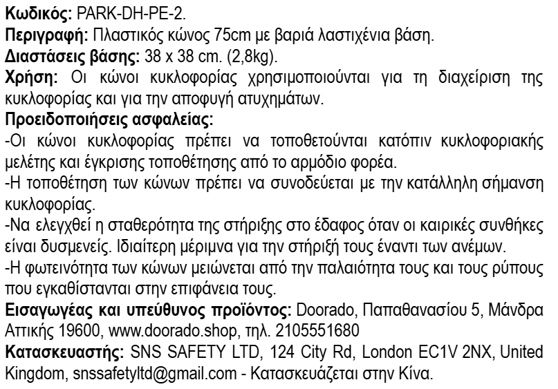 Πλαστικός κώνος σήμανσης 75 cm PARK-DH-PE-2