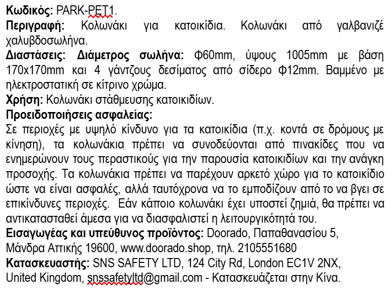 Το κολωνάκι παρκαρίσματος κατοικιδίων είναι κατασκευασμένο από γαλβανιζέ χαλυβδοσωλήνα Φ60 mm, ύψους 1005 mm με βάση 170x170 mm και 4 ισχυρούς γάντζους δεσίματος από σίδερο Φ12 mm. Βάρος 6 κιλά,