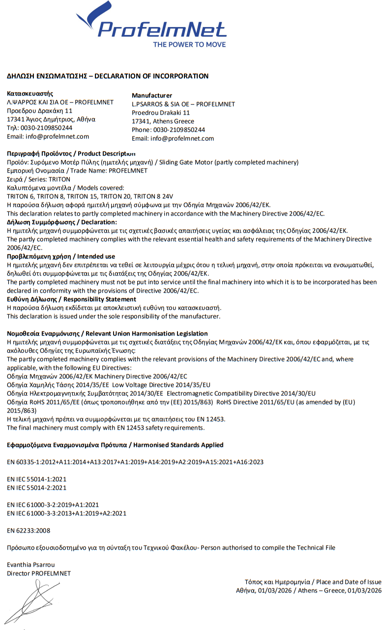 Σετ για συρόμενη γκαραζόπορτα με μοτέρ TRITON-1500 για έως 1500 κιλά αυλόπορτα, ενσωματωμένο πινακοδέκτη, 3 μέτρα μεταλλική κρεμαγιέρα και 1 τηλεχειριστήριο. Περιλαμβάνονται: βάση στήριξης, λαμάκια τερματικών διακοπτών, κλειδιά αποσύμπλεξης και οδηγίες εγκατάστασης στα Ελληνικά.