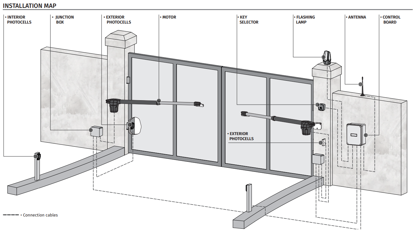 Πλήρες Κιτ μηχανισμού γκαραζόπορτας ανοιγόμενης δίφυλλης με δύο μοτέρ Motorline Professional LINCE 600, βάσεις μοτέρ, πινακοδέκτη σε στεγανό πλαστικό κουτί, σετ ενσύρματα φωτοκύτταρα ασφαλείας και δύο τηλεχειριστήρια.