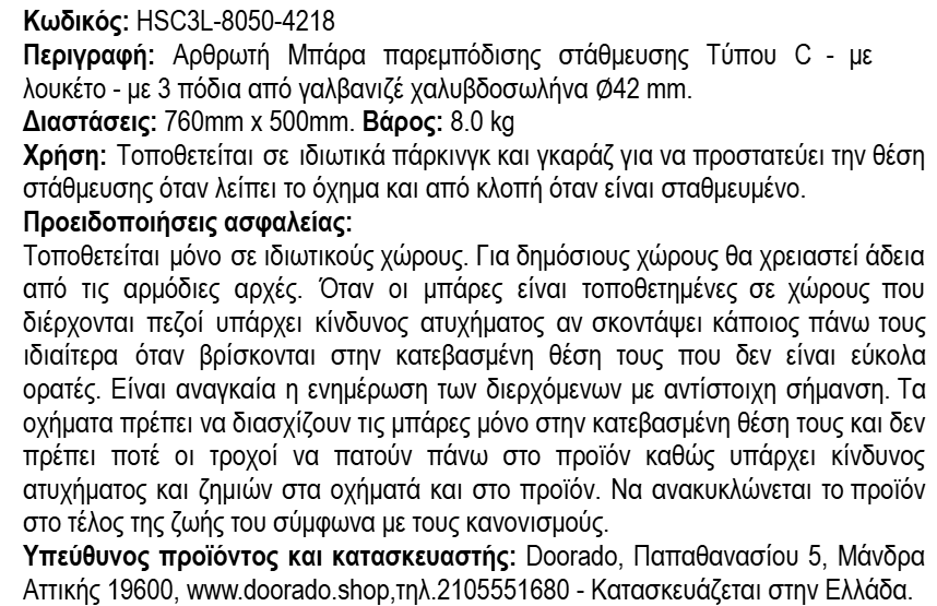 Η μπάρα στάθμευσης σχήματος C με 3 πόδια HSC3L-8050-4218-GAL είναι στιβαρή και αξιόπιστη. Είναι κατασκευασμένη από γαλβανιζέ χαλυβδοσωλήνα διαμέτρου Φ42mm και έχει διαστάσεις 760mm x 500mm. Διαθέτει ανακλαστικές ταινίες και κλειδώνει με λουκέτο το οποίο μπορεί εύκολα να αντικατασταθεί. Διατίθεται και βαμμένη σε χρώμα RAL.