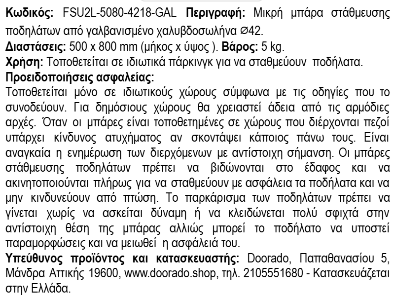 Η FSU2L-5080-4218-GAL είναι μικρή μπάρα στάθμευσης ποδηλάτων σχήματος Π. Ιδανική για καταστήματα αλλά και για ιδιωτική χρήση. Διατίθεται και βαμμένη.