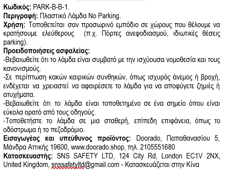 Το πλαστικό απαγορευτικό στάθμευσης PARK-B-B-1 (κολωνάκι σήμανσης) σε σχήμα λάμδα αποτελεί μία πρακτική και οικονομική λύση, προκειμένου να αποτραπεί προσωρινά η στάθμευση. Βρίσκει πάρα πολλές εφαρμογές, σε ράμπες φορτοεκφόρτωσης, εισόδους καταστημάτων, σημεία ανεφοδιασμού καταστημάτων κ.ά. Το κολωνάκι για πάρκινγκ είναι απλό και εύχρηστο καθώς αναδιπλούμενο μεταφέρεται εύκολα. Φέρει την ένδειξη "NO PARKING (απαγορεύεται το παρκάρισμα)" και έχει έντονο κίτρινο χρώμα προκειμένου να είναι ευδιάκριτο από απόσταση.