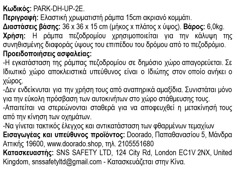 - Στις περιπτώσεις κυκλοφορίας πεζών ή τροχοφόρων κατά μήκος (παράλληλα) της θέσης εγκατάστασης της ραμπών PARK-DH-UP-2M τοποθετούνται τα αντίστοιχα ακριανά κομμάτια ράμπας PARK-DH-UP-2E.
