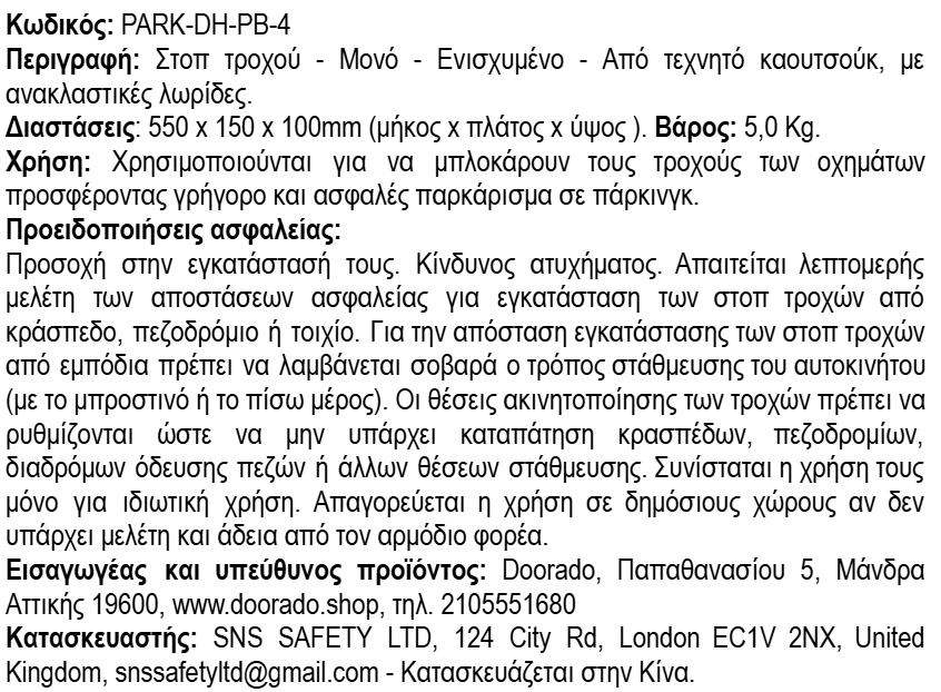 Τα stop τροχών είναι φιλικά προς το περιβάλλον, κατασκευασμένα από ανακυκλωμένα ελαστικά αυτοκινήτων. Κατασκευάζονται με χύτευση του υλικού οπότε αποτελούν ένα ενιαίο σώμα με υψηλή αντοχή, ιδιαίτερα στις καταπονήσεις από τα ελαστικά των αυτοκινήτων. Με τα ανακλαστικά στοιχεία που διαθέτουν είναι ευδιάκριτα ακόμα και τις νυχτερινές ώρες.