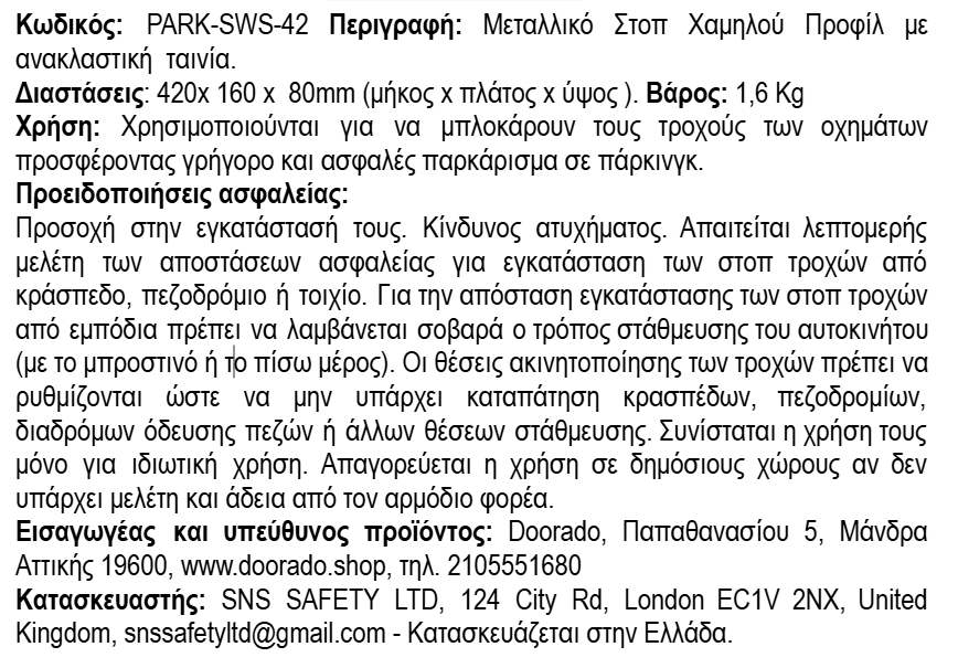 Τα stop τροχών είναι μεταλλικά, βαμμένα με ηλεκτροστατική βαφή για μεγαλύτερη αντοχή και με χαμηλό προφίλ για σπορ αυτοκίνητα. Με τα ανακλαστικά στοιχεία που διαθέτουν είναι ευδιάκριτα ακόμα και τις νυχτερινές ώρες.