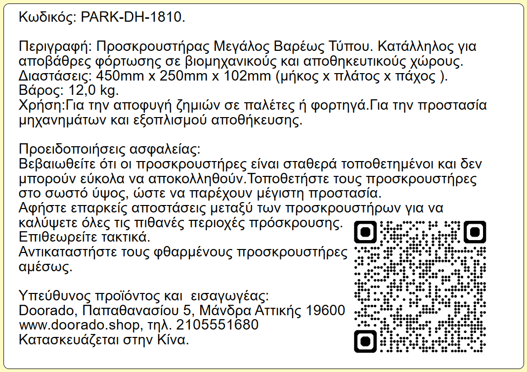 Εισαγωγέας και υπεύθυνος προϊόντος: Doorado, Παπαθανασίου 5, Μάνδρα Αττικής 19600, www.doorado.shop, τηλ. 2105551680. Κατασκευάζεται στην Κίνα.